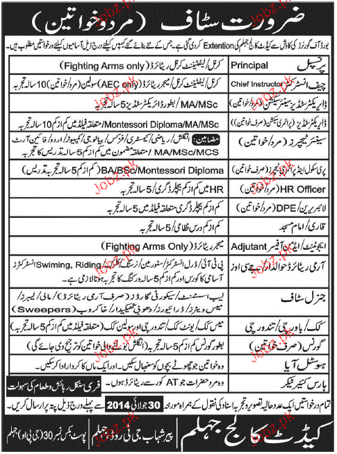 Principal, Chief Instructors, Teachers Job In Cadet College