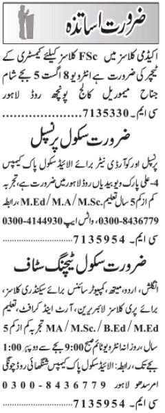 Private School Lahore, lahore Punjab Pakistan invites applications from eligible candidates for the post of computer science teacher, librarian, principal, math teacher, english teacher, coordinator, art teacher, urdu teacher, chemistry teacher and teacher as per advertisement of August 8, 2023 published in daily Jang Newspaper. Preferred Education is MA, M.ed, Bachelor, B.ed, Master and M.sc etc.