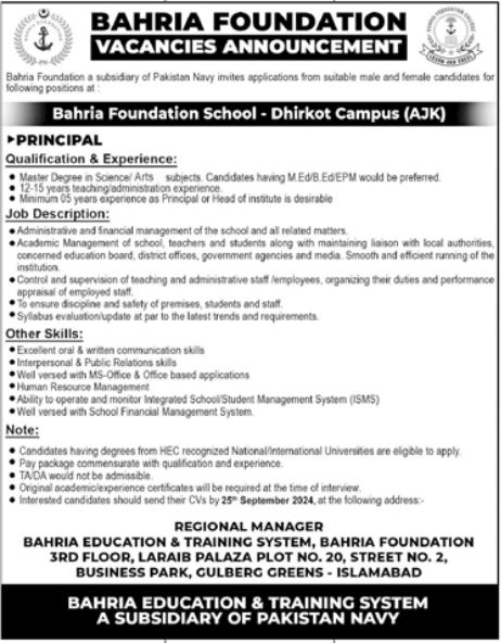 Bahria Foundation Schools BFS Bagh, bagh AJK Pakistan invites applications from eligible candidates for the post of principal as per advertisement of September 11, 2024 published in daily Jang Newspaper. Educational qualifications required Master, M.ed and B.ed etc.