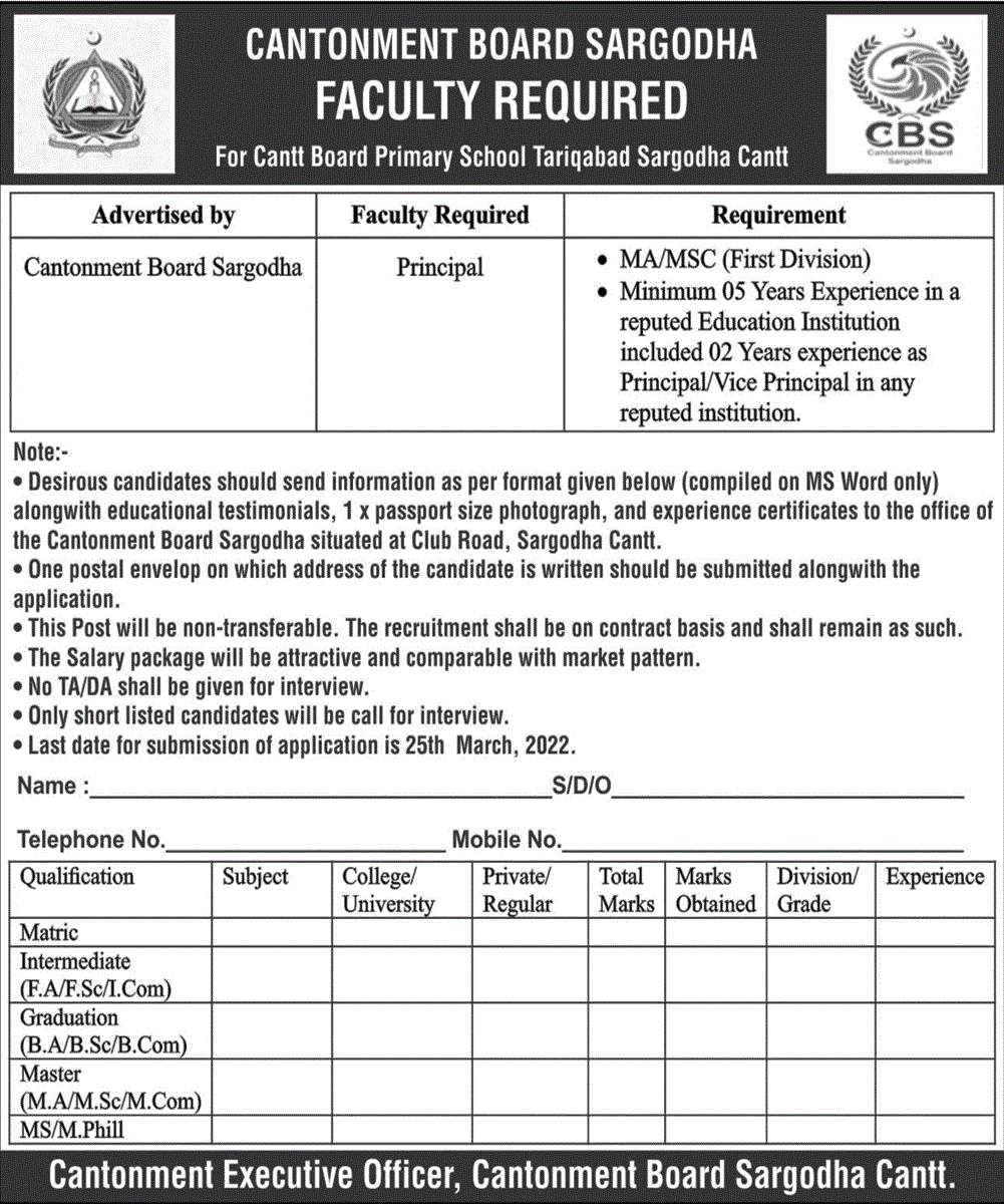Cantt Board Primary School jobs advertisement dated about 4 March 2022 in daily Nawaiwaqt Newspaper invites application for the vacant post of principal in Sargodha, sargodha Punjab Pakistan. M.sc and MA etc. educational qualification will be preferred.