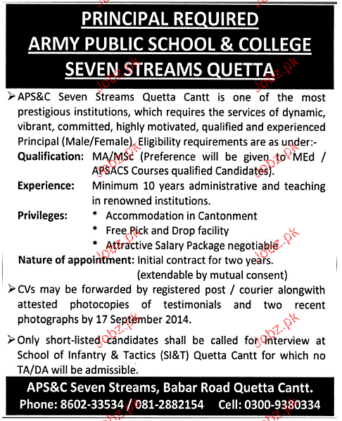 Latest Army Public School APS Teaching Posts Quetta 2025
