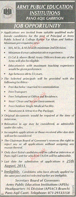 Latest Army Public School APS Other Posts Rahim Yar Khan 2025