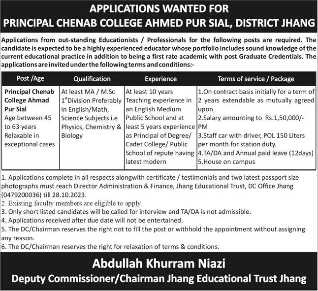 Principal Jobs 2023 In Chenab College Ahmed Pur Sial Jhang