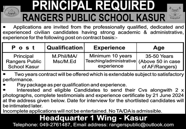 Rangers Public School jobs advertisement dated about 13 June 2024 in daily Nawaiwaqt Newspaper invites application for the vacant post of principal in Kasur, kasur Punjab Pakistan. M.sc, Mphil, M.ed and MA etc. educational qualification will be preferred.