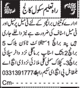 Rah e Taleem School & College is looking for candidates for following posts as per job advertisement published in daily Jang Newspaper of March 4, 2025 for location Satellite Town Quetta, quetta Balochistan Pakistan: