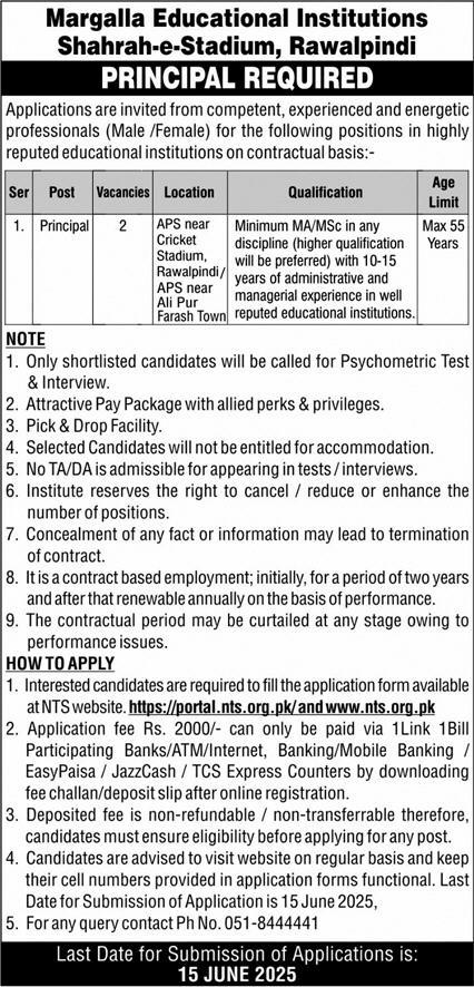 Margalla Educational Institutions is looking for candidates for following posts as per job advertisement published in daily Express Newspaper of May 25, 2025 for location Rawalpindi, rawalpindi Punjab Pakistan: