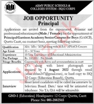 Army Public School & College invites applications for job positions advertised in daily Jang dated 24 July 2022 for following vacancies in Quetta, quetta Balochistan Pakistan.