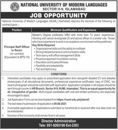 Vacancies in National University of Modern Languages NUML Advertisement July 2021