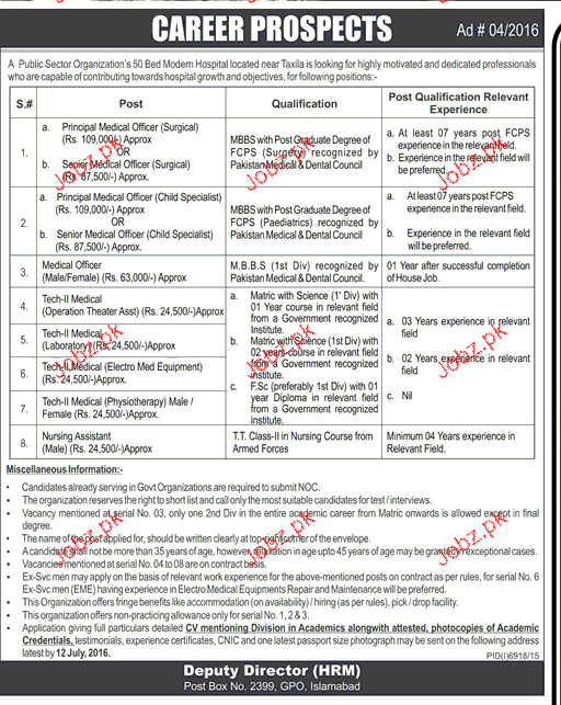 Apply as per details in job advertisement. Login to view further details of how to apply via https://www.jobz.pk online.