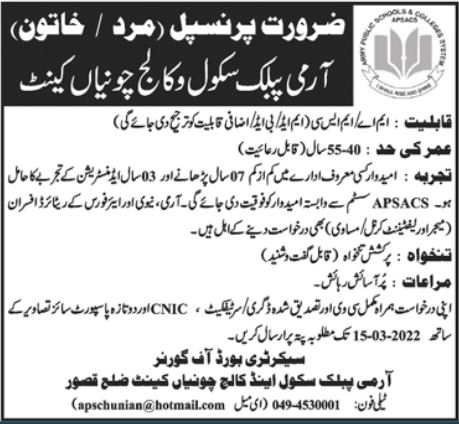 Vacant posts including principal are announced in Army Public School & College Chunian, chunian Punjab Pakistan as per 13 March 2022 advertisement in daily Jang Newspaper. Educational qualifications required M.sc, M.ed, MA and B.ed etc.