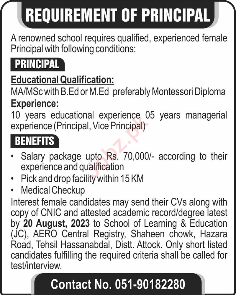 Vacant posts including principal are announced in School of Learning and Education Hassan Abdal, attock and hassan abdal Punjab Pakistan as per 13 August 2023 advertisement in daily Nawaiwaqt Newspaper. Preferred Education is M.ed, M.sc, MA and B.ed etc.