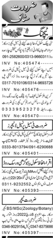 Vacant posts including biology teacher, female principal, teacher, zoology teacher, female teacher, urdu teacher, principal, science teacher, physics teacher, botany teacher and english teacher are announced in Private School Peshawar, peshawar Khyber Pakhtunkhwa KPK Pakistan as per 3 March 2022 advertisement in daily Aaj Newspaper. Persons with Bachelor and Master etc. education can apply.