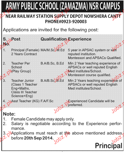 Latest Army Public School APS Teaching Posts Nowshera 2025