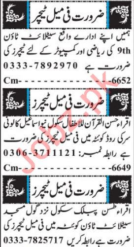 Principal, Vice Principal, Coordinators, Teacher, Junior Teacher, Primary Teacher, Secondary Teacher, Subject Teacher (Maths, Physics, Chemistry, Biology, English, Urdu, Pak Studies & Islamic Studies), Montessori Teacher and Female Teacher required in well progressive schools.