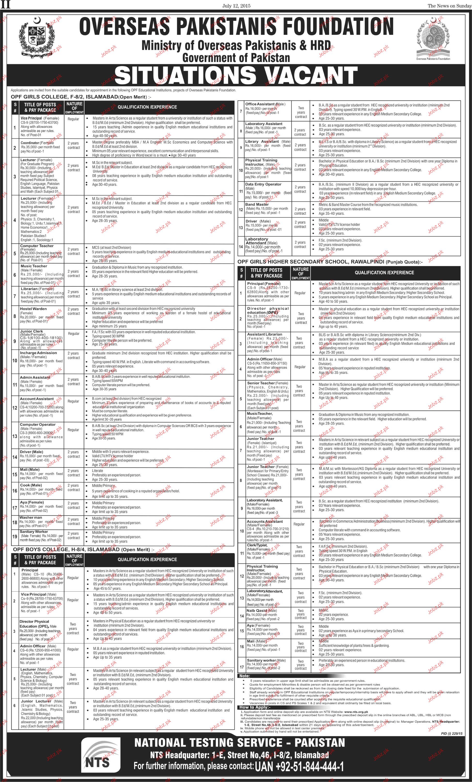 Principal, Teachers, PTI, Lab Assistants Job In OPF
