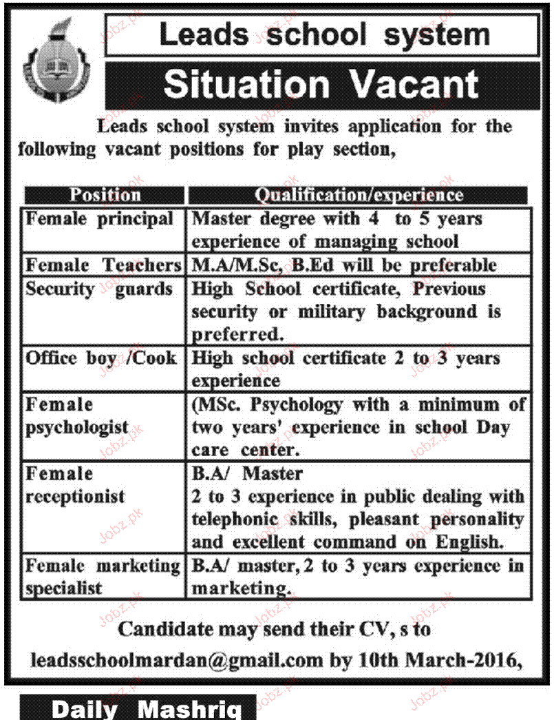 Apply as per details in job advertisement. Login to view further details of how to apply via https://www.jobz.pk online.