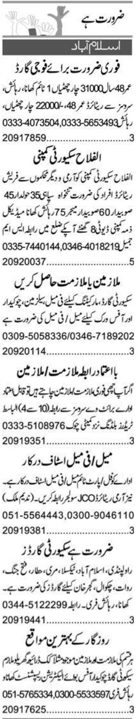 Private Company jobs advertisement dated about 26 December 2023 in daily Express Newspaper invites application for the vacant post of female staff, security guard, chowkidar, salesman, cook, retried staff, electricain, receptionist, driver and male staff in Islamabad, islamabad Islamabad Pakistan. Persons with Bachelor, Middle, Intermediate and Matric etc. education can apply.