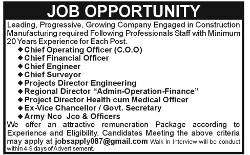 A well known and leading construction and manufacturing company is hiring qualified and experienced candidates for the posts of Chief Operating Officer, Chief Financial Officer, Chief Engineer, Chief Surveyor, Project Director Engineering, Regional Director Health Cum Medical Officer, Ex Vice Chancellor, Army NCO JCO Officer in Lahore.