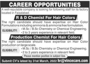 Vacant posts including production chemist and rd chemist are announced in Private Company Lahore, lahore Punjab Pakistan as per 27 March 2022 advertisement in daily Jang Newspaper. Preferred Education is Bachelor and Master etc.