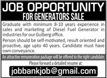 Private Company jobs advertisement dated about 2 June 2024 in daily Jang Newspaper invites application for the vacant post of generator sale in Lahore, lahore Punjab Pakistan. Candidates with Bachelor etc. educational background will be preferred.