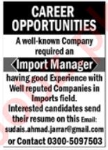 Private Company Lahore, lahore Punjab Pakistan invites applications from eligible candidates for the post of import manager as per advertisement of July 28, 2024 published in daily Jang Newspaper. MS, Bachelor and Master etc. educational qualification will be preferred.