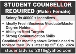 Private Company jobs advertisement dated about 8 September 2024 in daily Jang Newspaper invites application for the vacant post of female staff, student counsellor and male staff in Lahore, lahore Punjab Pakistan. Educational qualifications required MS, Bachelor and Master etc.
