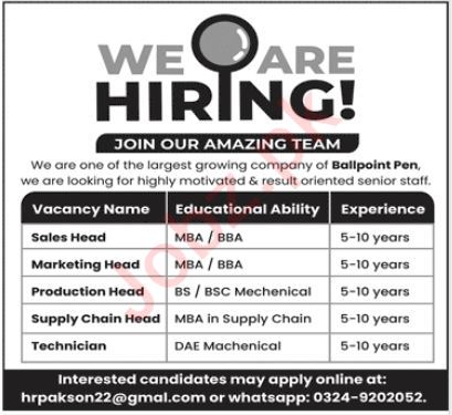 Private Company jobs advertisement dated about 17 November 2024 in daily Jang Newspaper invites application for the vacant post of sales head, marketing head, technician, supply chain head and production head in Lahore, lahore Punjab Pakistan. Preferred Education is Master, Intermediate, Bachelor and MS etc.