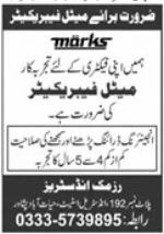 Vacant posts including metal fabricator are announced in Private Factory Peshawar, peshawar Khyber Pakhtunkhwa KPK Pakistan as per 19 August 2025 advertisement in daily Jang Newspaper. Candidates with Intermediate, Middle and Matric etc. educational background will be preferred.