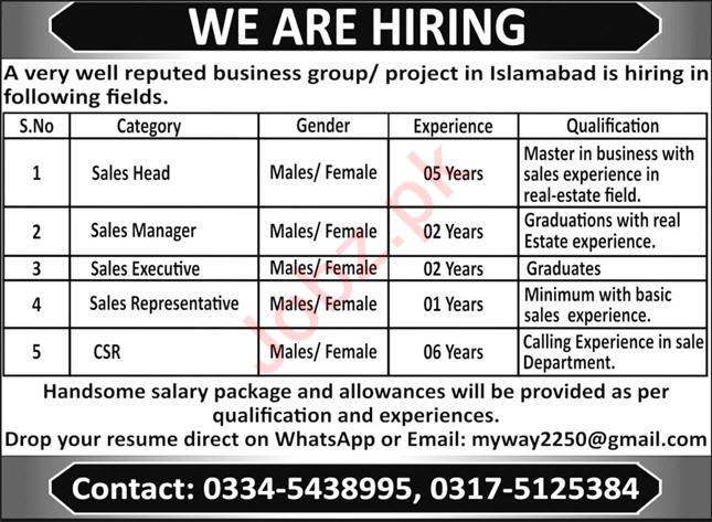 Private Group jobs advertisement dated about 28 January 2024 in daily Express Newspaper invites application for the vacant post of sales executive, csr, sales manager, sales representative and sales head in Islamabad, islamabad Islamabad Pakistan. Candidates with Bachelor, Master and MS etc. educational background will be preferred.