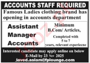 Vacant posts including assistant manager accounts are announced in Private Group Lahore, lahore Punjab Pakistan as per 17 November 2025 advertisement in daily Jang Newspaper. Educational qualifications required B.com and Bachelor etc.