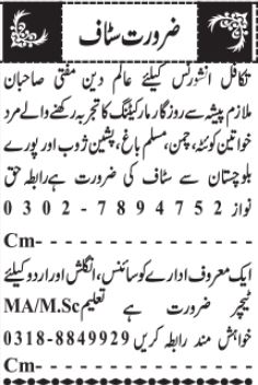 Private Group Quetta, quetta Balochistan Pakistan invites applications from eligible candidates for the post of urdu teacher, science teacher, english teacher and marketing staff as per advertisement of October 17, 2023 published in daily Jang Newspaper. Master, Bachelor and MS etc. educational qualification will be preferred.