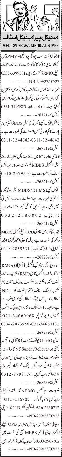 Private Hospital Karachi, karachi Sindh Pakistan invites applications from eligible candidates for the post of rmo doctor, bds doctor, paramedical staff, lady doctor, receptionist, consultant, sonologist, female assistant, medical staff, gynecologist and instructor as per advertisement of July 25, 2023 published in daily Jang Newspaper. Persons with MBBS, BDS, Matric and Intermediate etc. education can apply.