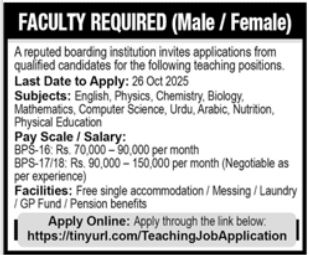 Private Institute jobs advertisement dated about 12 October 2025 in daily Jang Newspaper invites application for the vacant post of maths teacher, biology teacher, urdu teacher, physics teacher, chemistry teacher, computer science teacher, nutrition teacher, english teacher, arabic teacher and physical education teacher in Multan, multan Punjab Pakistan. Persons with Bachelor, MS and Master etc. education can apply.