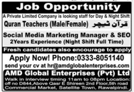 AMD Global Enterprises Rawalpindi, rawalpindi Punjab Pakistan invites applications from eligible candidates for the post of social media marketing manager, quran teacher and seo as per advertisement of February 11, 2024 published in daily Jang Newspaper. Preferred Education is Intermediate and Bachelor etc.