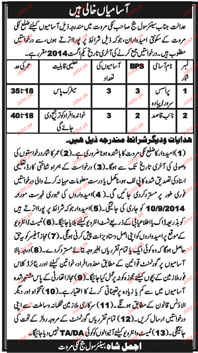 Process Servers and Naib Qasid Job in Court of Senior Civil