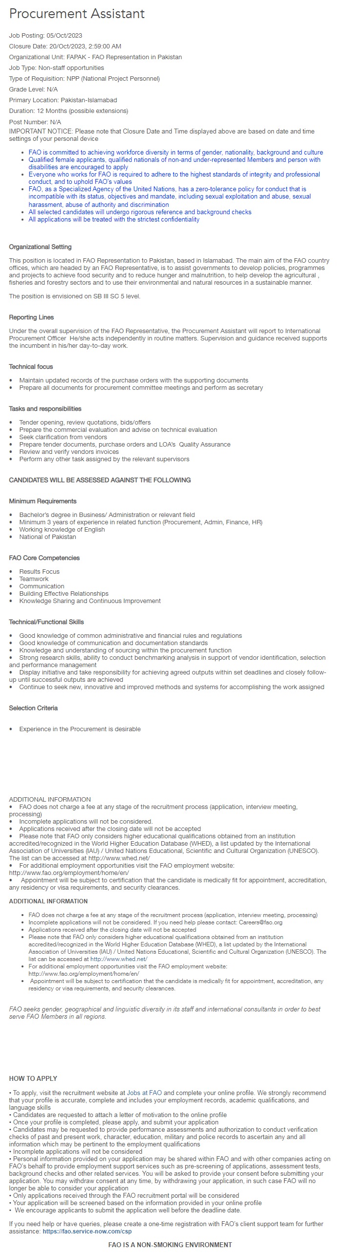 Procurement Assistant Jobs 2023 In FAO Pakistan
