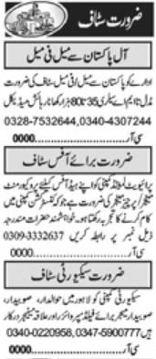 Private jobs advertisement dated about 3 November 2023 in daily Khabrain Newspaper invites application for the vacant post of purchase manager, male female staff, field supervisor, procurement manager, retired subedar major, retired subedar and retired havaldar in Lahore, lahore Punjab Pakistan. Educational qualifications required Matric, Middle, Master, Bachelor and Intermediate etc.