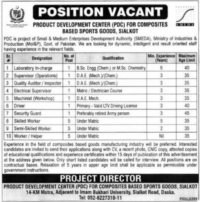 Product development Center PDC For Composites Based Sports Goods Sialkot Punjab Pakistan invites applications from eligible candidates for the post of quality inspector, electrical supervisor, helper, machnist, worker, supervisor, skilled worker, quality auditor, security guard, driver, semi skilled worker and laboratory incharge as per advertisement of January 30, 2022 published in daily Daily Pakistan Newspaper. Educational qualifications required Bachelor, B.E, Intermediate and Matric etc.