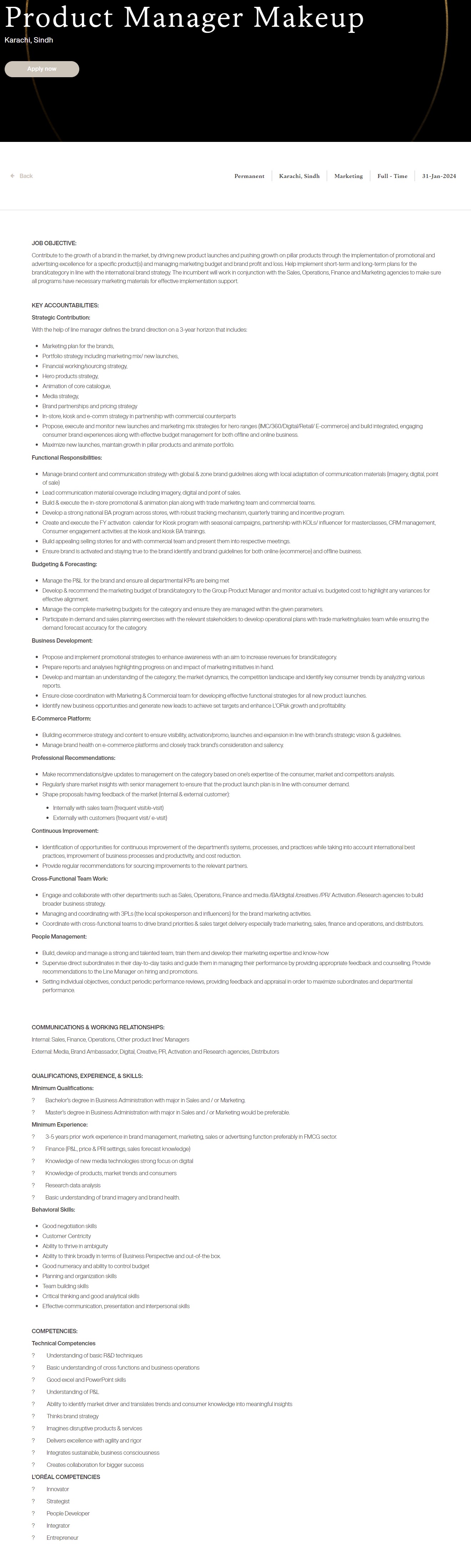 LOreal Cosmetics Company Karachi, karachi Sindh Pakistan invites applications from eligible candidates for the post of product manager markeup as per advertisement of January 25, 2024 published in daily Other Newspaper. Master and Bachelor etc. educational qualification will be preferred.