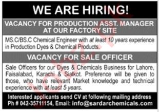 Sardar Chemical Industries jobs advertisement dated about 17 August 2025 in daily Jang Newspaper invites application for the vacant post of sale officer and assistant production manager in Karachi, karachi Sindh Pakistan. Persons with Master, Bachelor and M.sc etc. education can apply.