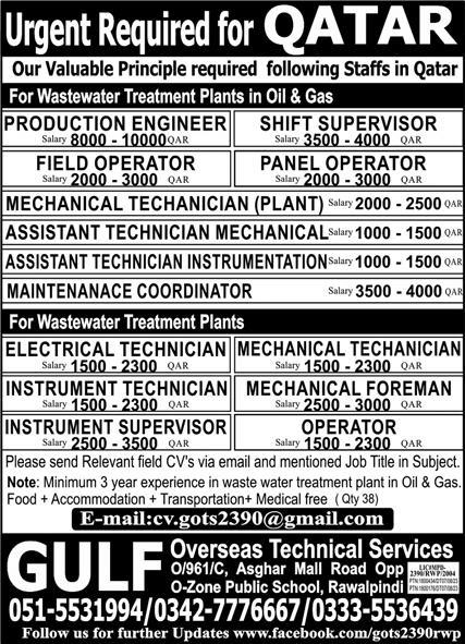 Vacant posts including assistant technician mechanical, production engineer, operator, electrical technician, shift supervisor, assistant technician instrumentation, panel operator, mechanical technician plant, field operator, mechanical technician, maintenance coordinator, instrument technician, mechanical foreman and instrument supervisor are announced in Gulf Overseas Technical Services Qatar, qatar Qatar as per 9 August 2023 advertisement in daily Express Newspaper. Candidates with Intermediate, Bachelor, B.E, DAE and Matric etc. educational background will be preferred.