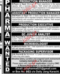 Production Manager, Assistant Production Manager and Packaging Supervisors are required in Karachi. Send your application / CV Along with All necessary documents.