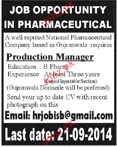 Production Manager is required in Pharmaceutical Company in Lahore.