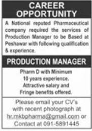 Pharmaceutical Company is looking for candidates for following posts as per job advertisement published in daily Jang Newspaper of August 24, 2023 for location Peshawar, peshawar Khyber Pakhtunkhwa KPK Pakistan: