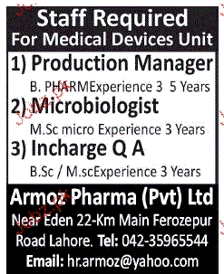 Production Manager, Microbiologist and Incharge QA are required in Lahore.