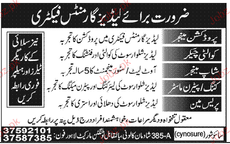 Production Manager, Quality Checkers, Shop Manager Wanted