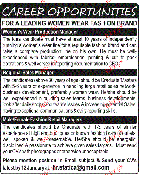 Apply as per details in job advertisement. Login to view further details of how to apply via https://www.jobz.pk online.