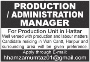 Vacant posts including production administration manager are announced in Production Unit Hattar, hattar Khyber Pakhtunkhwa KPK Pakistan as per 15 July 2023 advertisement in daily Jang Newspaper. Preferred Education is MS, Bachelor and Master etc.