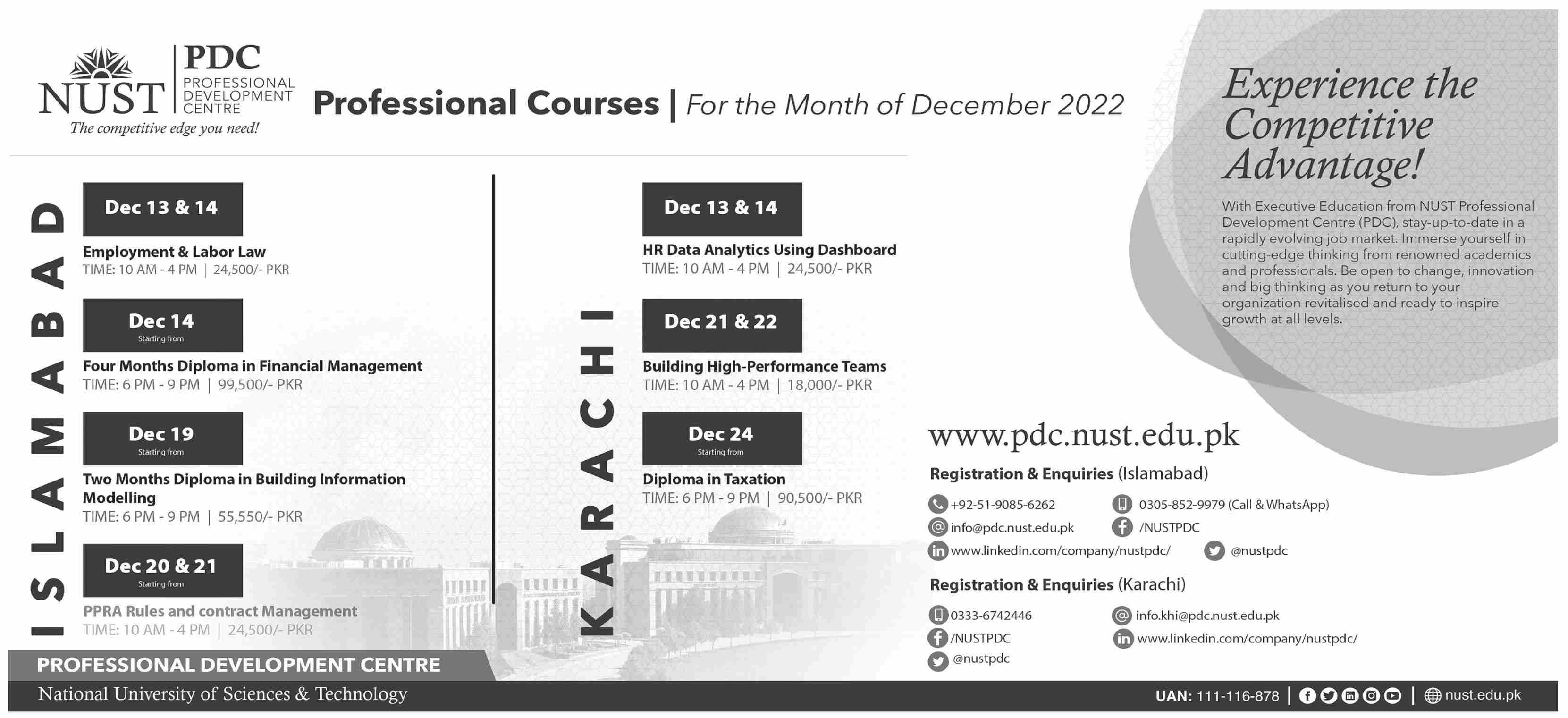 National University of Science & Technology NUST Employment and Labor Law, Four Monts Diploma in Financial Management, Two Months Diploma in Building Information Modeling, PPRA Rules and Contract Management, HR Data Analytics Using Dashboard, Building High Performance Teams, Diploma in Taxatio admissions 2022 has been announced. Students who want to take admissions in National University of Science & Technology NUST Islamabad Karachi Islamabad Pakistan for academic year 2022 to continue education in Management University can apply. Eligible candidates for admissions in Course and Diploma can apply as per Government institute criteria and before closing date 26 December 2022 after reading advertisement online. Read newspaper ad for exact details.