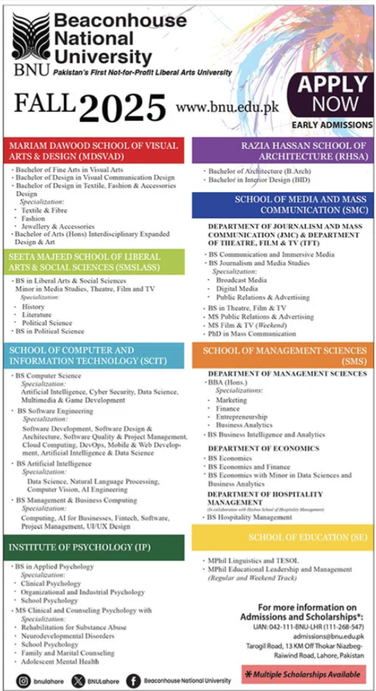Beaconhouse National University Professional Diploma Courses admissions 2025 has been started. Eligible students who qualify as per admission criteria in Beaconhouse National University Lahore Punjab Pakistan can apply in Science University for academic year 2025. Students for admissions in can apply for online or campus classes as per Private institute criteria till admission closing date. Read newspaper ad for exact details.